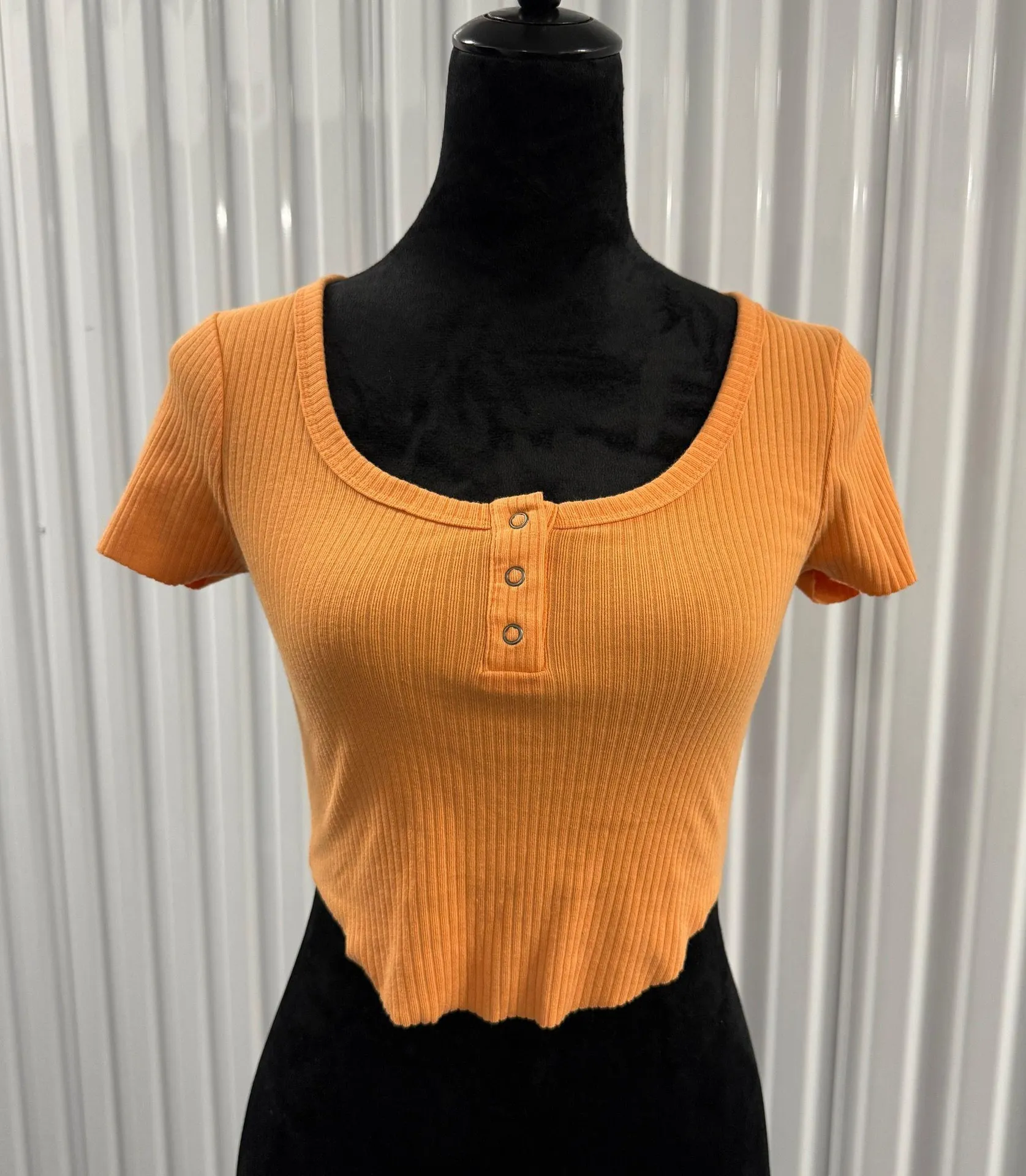 Women’s orange ribbed lightweight short sleeve shirt with raw hemline and three snap button detail o... Show more