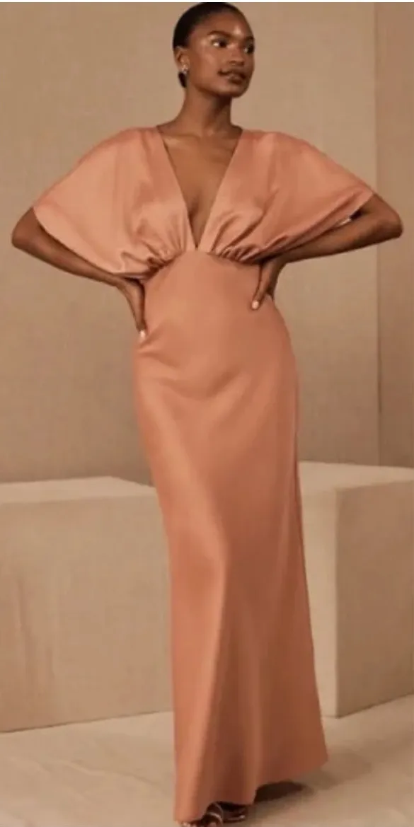 BHLDN Leila Deep-V Flutter Sleeve Satin Charmeuse Gown Dress Size 10. In great pre owned condition. (Brand tag is marked through from retailer to prevent return). Timelessly elegant, the BHLDN Leila Deep-V Flutter-Sleeve Satin A-Line Gown pairs a gracefully draped bodice with soft sleeves and a flowy skirt. A daring plunge neckline completes the look. Polyester; polyester lining Satin maxi dress silhouette Invisible side zipper Deep-v neckline Short flutter sleeves A-line silhouette Tags: black tie, Gown, gala, special occasion, event, pageant, prom, ball, formal, evening, wedding guest, NYE, embellished, statement piece, show stopper, eye catching, shimmer, sparkle, dazzling, glamorous, sophisticated, opera, mother of the bride MOB, mother of the groom MOG, Tags: event, special occasion, wedding guest, formal, dance, homecoming, ceremony, cocktail, party, prom, bridesmaid