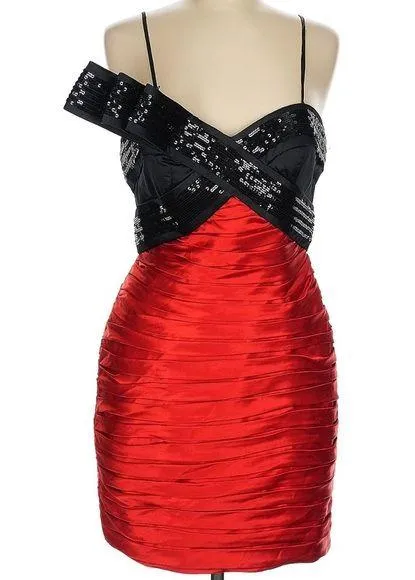 This striking bodycon dress by Terani Couture features a captivating black sequined bodice with an asymmetrical shoulder design, complemented by a vibrant red satin skirt. Perfect for a cocktail event, the sleeveless dress showcases a unique blend of textures and colors, ensuring you stand out in any crowd. Zipper back Great, preowned condition, no found flaws Smoke free home