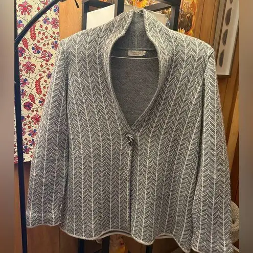 This Biana G. cardigan is a designer piece made in Italy. The sweater features a striped pattern, open neckline, and long asymmetrical sleeves. The gray color and wool material make it a classic piece for any occasion. The cardigan is a size medium and has never been worn, still with the tag attached. The vintage-inspired design adds a touch of Italian fashion to any wardrobe.
