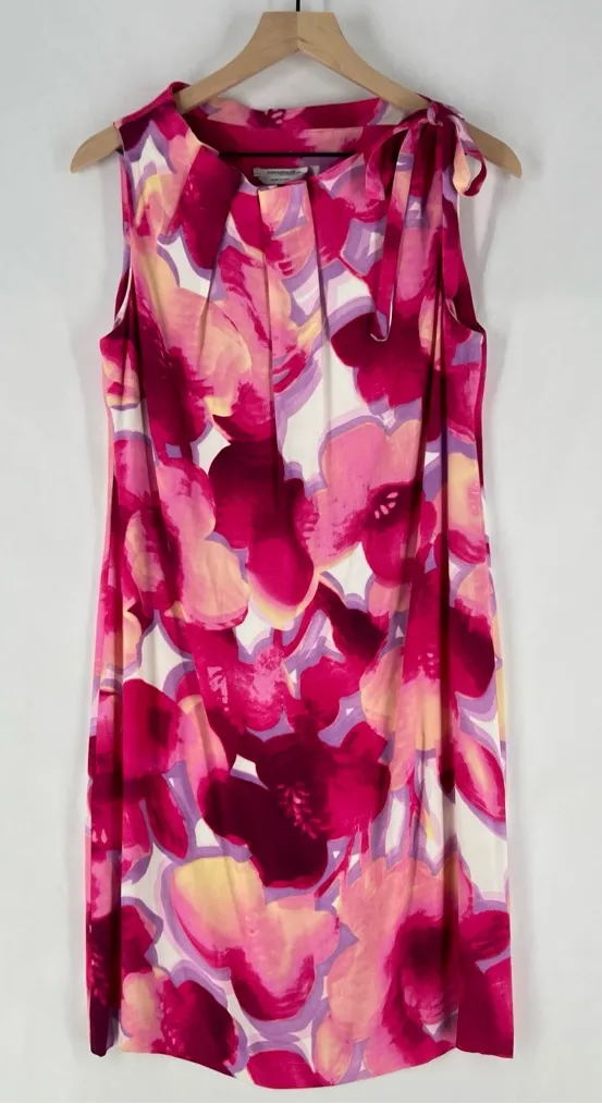 Biancoghiaccio Floral Print Lightweight Flowy Pleated Tie Boatneck Dress Size: 44 (M) floral print colorful and bright box pleated neckline boat neck tie at the neck shift dress lightweight flowy material unlined 1707