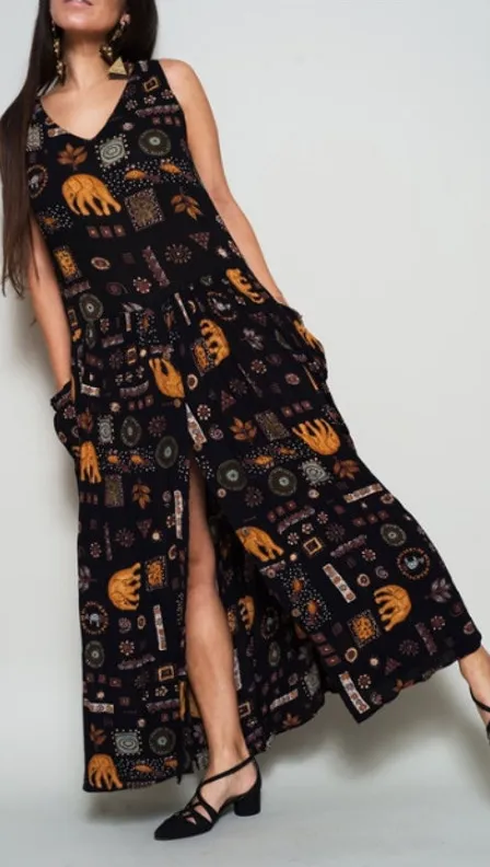 Bila Womens Vintage Boho Hippie Ethnic Elephant Print Front Slit Dress in Black. Size small. Good preowned condition. No visible flaws. - Elephant Ethnic Print - Sleeveless - V-Neck - Front Slit - Gauzy Fabric - Maxi Length - A-Line - Pockets - 100% Rayon Tags- VTG Vintage Boho Bohemian Hippie Artsy Art To Wear Artisan Approximate Measurements While Laying Flat: Pit To Pit: 17" Length: 53" All Items Come From A Smoke Free Home ! All Reasonable Offers Welcome !
