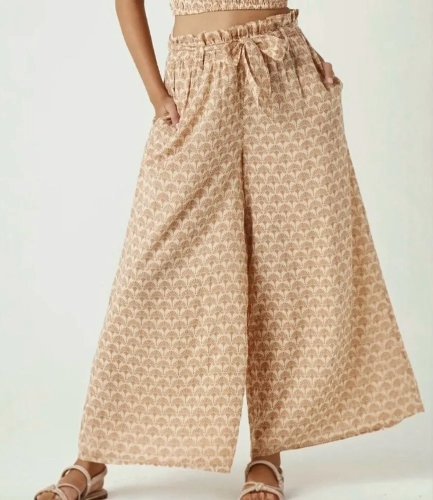 Crafted from thoughtfully sourced materials, this paper bag pant is cut to a wide leg palazzo silhouette and features side seam pockets for added comfort. Fully lined for an elevated finish, style this pant with a crop top or simple white tank for a playful feminine look. Traditional Indian batik print featuring a repeating fan motif in tan and cream. Pull-on design. Belt loops. On-seam pockets. 100% cotton. Fully lined. Great preowned condition. Please note: stock photos show a sash belt, no belt is included. BRAND: Bila77 SIZE: medium COLOR: tan & cream WAIST: 14” RISE: 12” INSEAM: 27” LEG OPENING: 19” CONDITION: previously owned ORIGIN: India Marked sizes will vary by designer • All measurements are approximate and taken flat in inches • Color may vary on your screen. •Fast Shipping •Small Business •Carefully Packaged, Smoke-Free •5-Star Seller