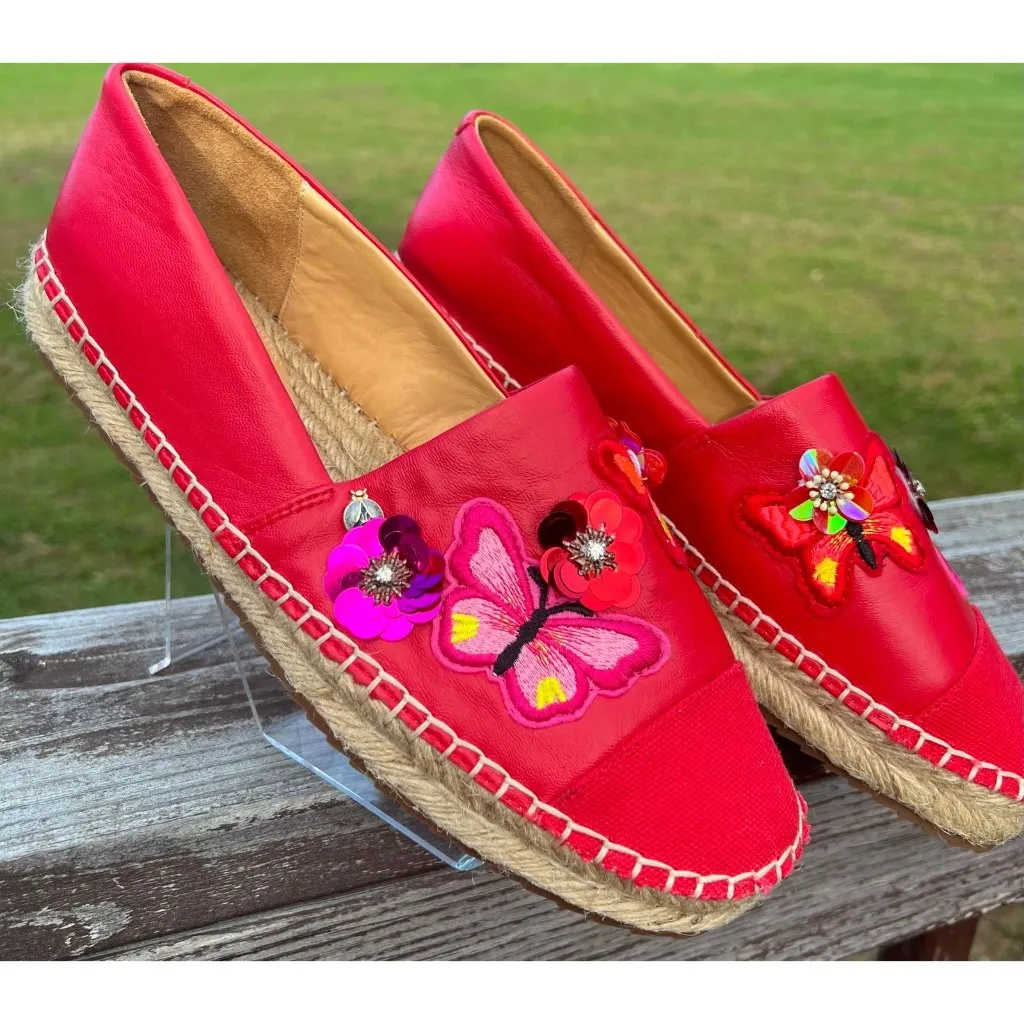 Bill Blass Wyatt Red Espadrilles Slip On with Embroidered Butterflies, sequined Flowers. These are g... Show more