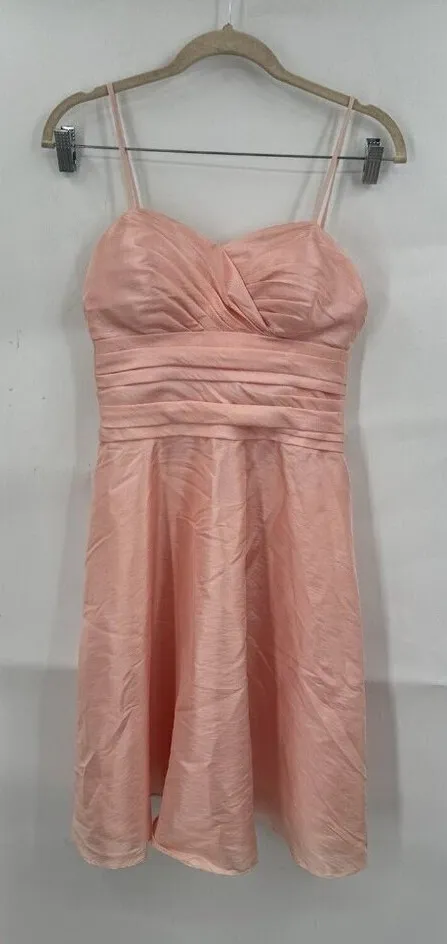 Great pre owned condition. Size 8. Zip back closure. Shiny fabric. Has a bandage style chest . Lined. Shoulder straps are not adjustable. Has mild chest padding, the pit to pit is measured from the back to make sure the chest padding did not skew the chest measurement. All measurements are approximate: 14 inches pit to pit. 26 inch waist. 34 inch hip. 33 inch length. O3