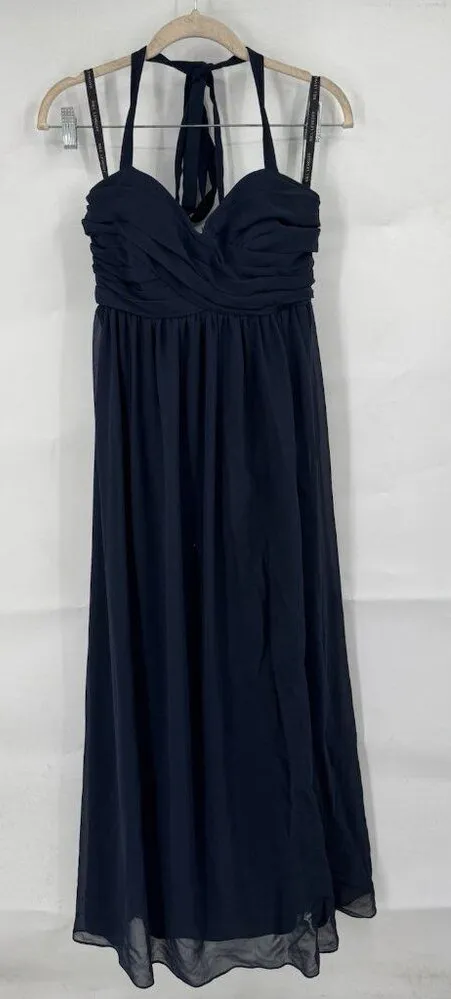 Great pre owned condition. Size 10. Navy blue colorway. Lined. Halter neck with no shoulder straps. All measurements are approximate: 17 inches pit to pit. 28 inch waist. 56 inch length from neckline to bottom hem. C12