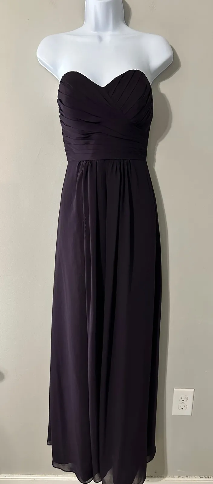 Material: Polyester Keywords: Bill Levkoff, strapless dress, chiffon dress, bridesmaid dress, evening gown, formal dress, purple dress, sweetheart neckline, pleated bodice, empire waist, floor length, size 4, party dress, special occasion dress, formal wear All pre owned clothing will be cleaned according to care instructions with unscented detergent. All items stored in polybags Comes from a smoke free home