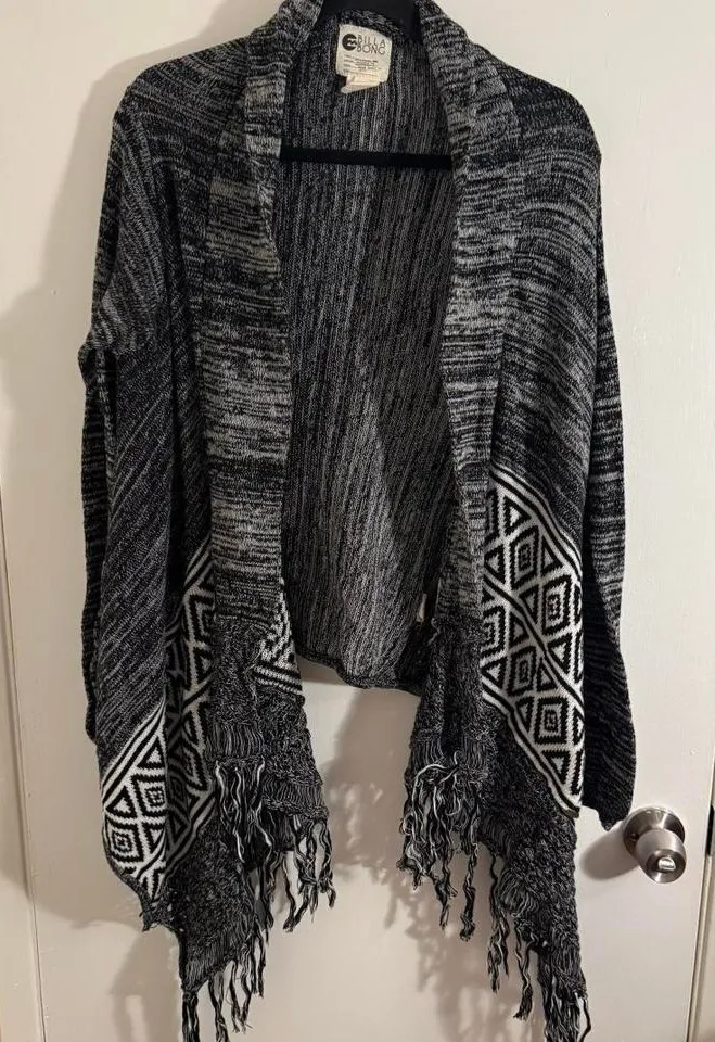 Wrap yourself in cozy sophistication with this Billabong knit cardigan. The marled black and white y... Show more