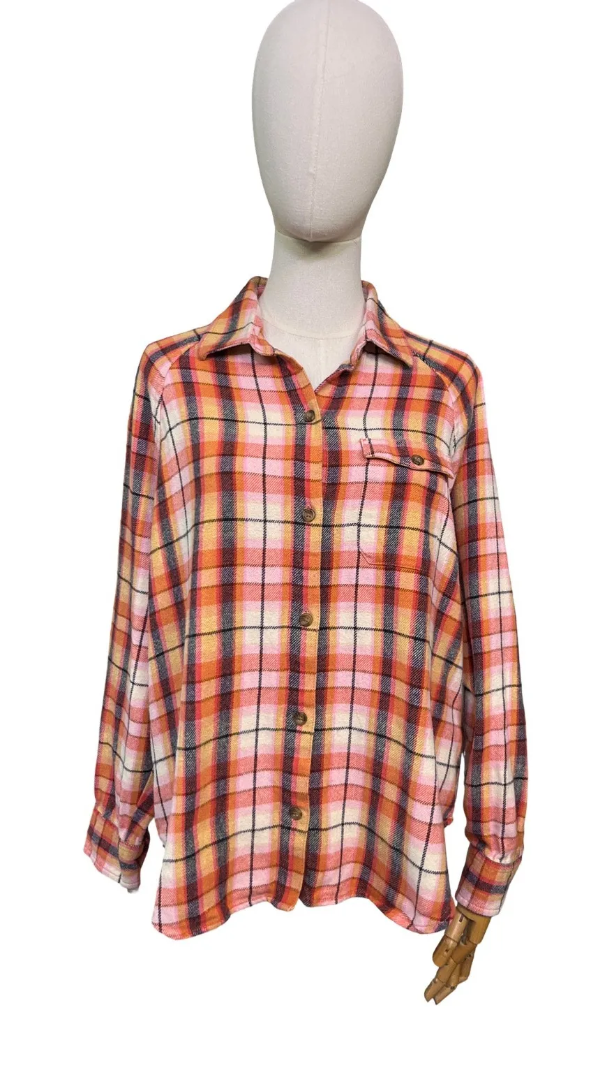 Authentic Billabong women’s long sleeve flannel shirt in a warm, sun-washed plaid palette of pink, o... Show more