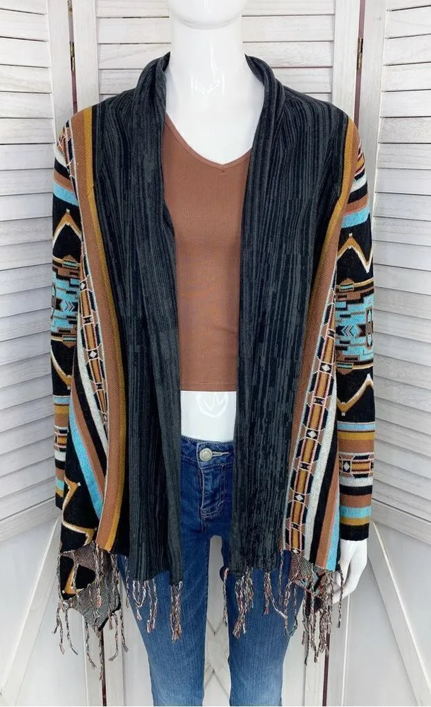 Billabong Dream Chaser Aztec Print Fringe Hem Cardigan Sweater Size Small Dark charcoal gray Mul... Show more