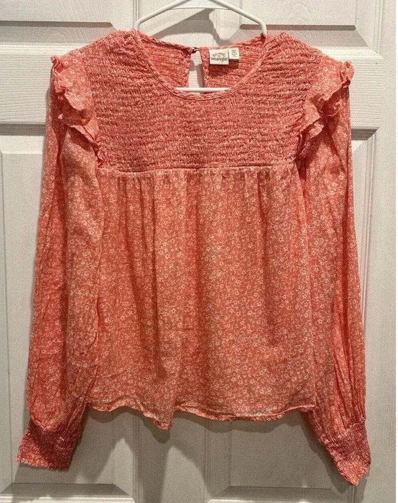 Billabong X Wrangler Top Women's Pink Long Sleeve Peasant Sleeve Size Large Euc. No flaws. Ditsy flo... Show more