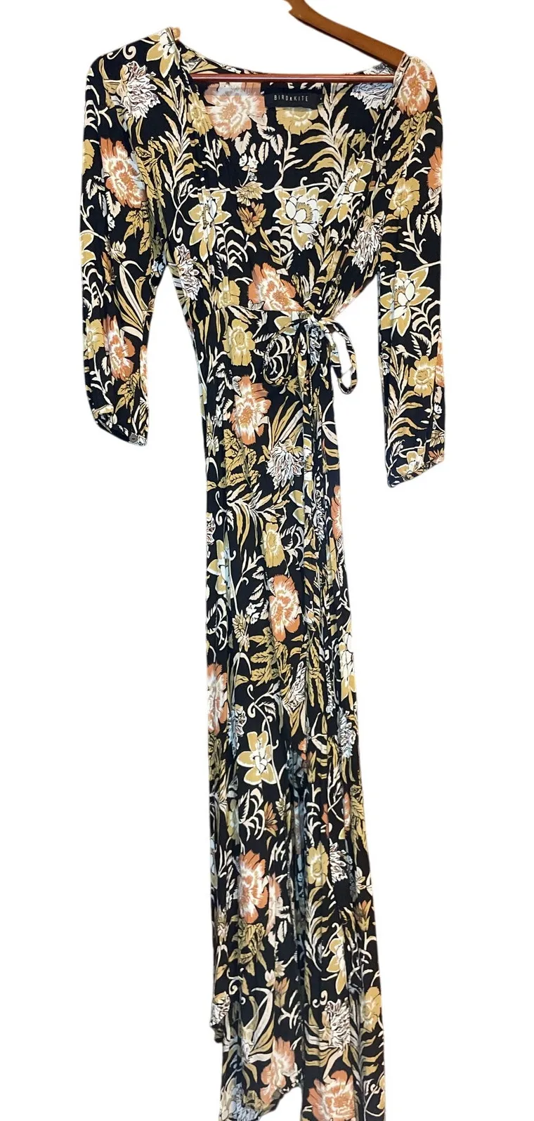 Bird and Kite maxi length wrap dress Black with gorgeous botanical print 100% rayon Sustainable, p... Show more