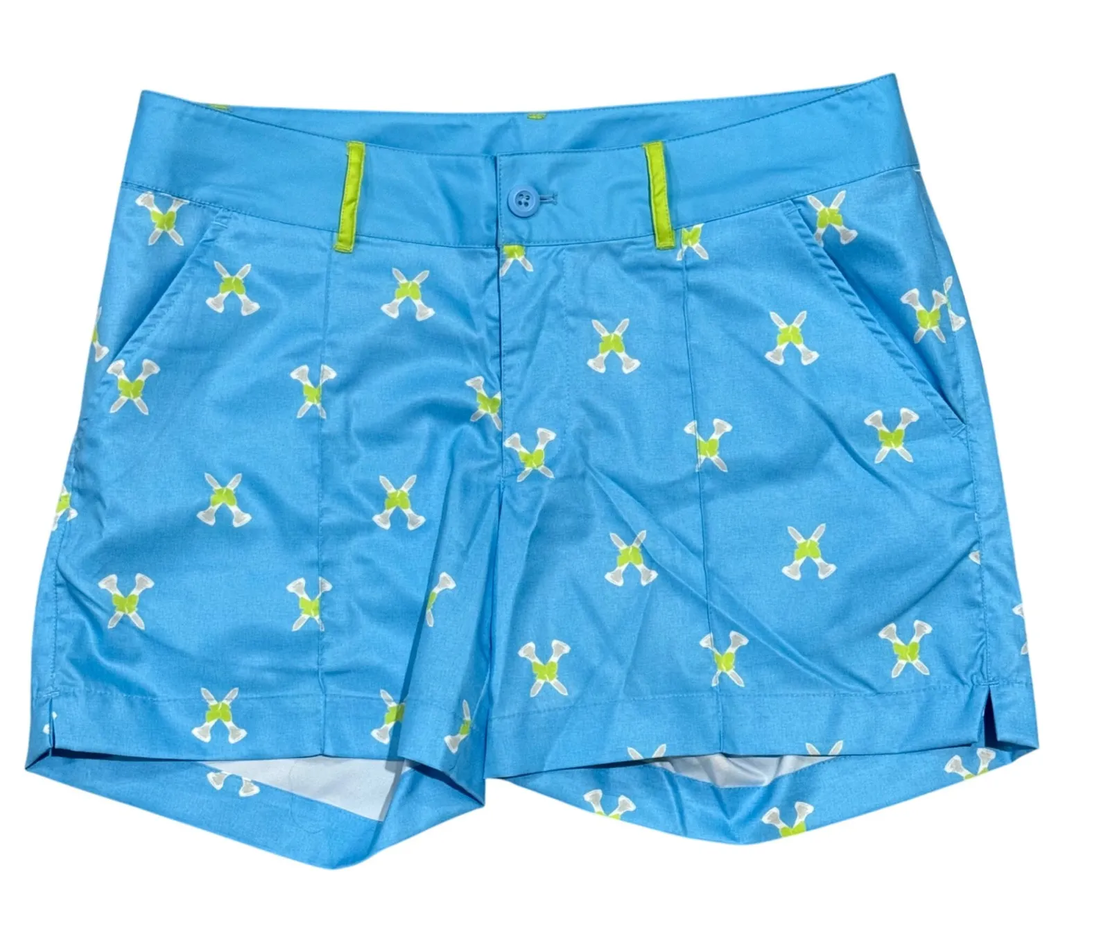 New with Tags- Birdies & Bows women's Golf Shorts size 6- Swing into style with these vibrant Birdies And Bows golf shorts, designed to bring a playful touch to your game. The cheerful blue hue is adorned with an all-over print of crossed golf clubs in white and lime green, adding a whimsical flair. The comfortable fit and stylish design make them perfect for a day on the green or a casual outing with friends. Size 6 Measurements Rise 9" Inseam 5" Waist measured flat 16" Fabric 100% polyester Style: Athletic Department: Women Material: Polyester Fabric Type: Satin Fit: Athletic Occasion: Activewear Performance/Activity: Golf Front Type: Flat Front Pattern: Geometric Features: Pockets, Slit Theme: Outdoor, Golf Closure: Button Accents: Button, Embroidered, Logo Rise: Mid Pocket Type: Slash Pocket Keywords: Birdies And Bows, golf shorts, womens shorts, athletic shorts, printed shorts, summer shorts, resort wear, active lifestyle, sporty, casual shorts, golf fashion, blue shorts, club print, performance shorts