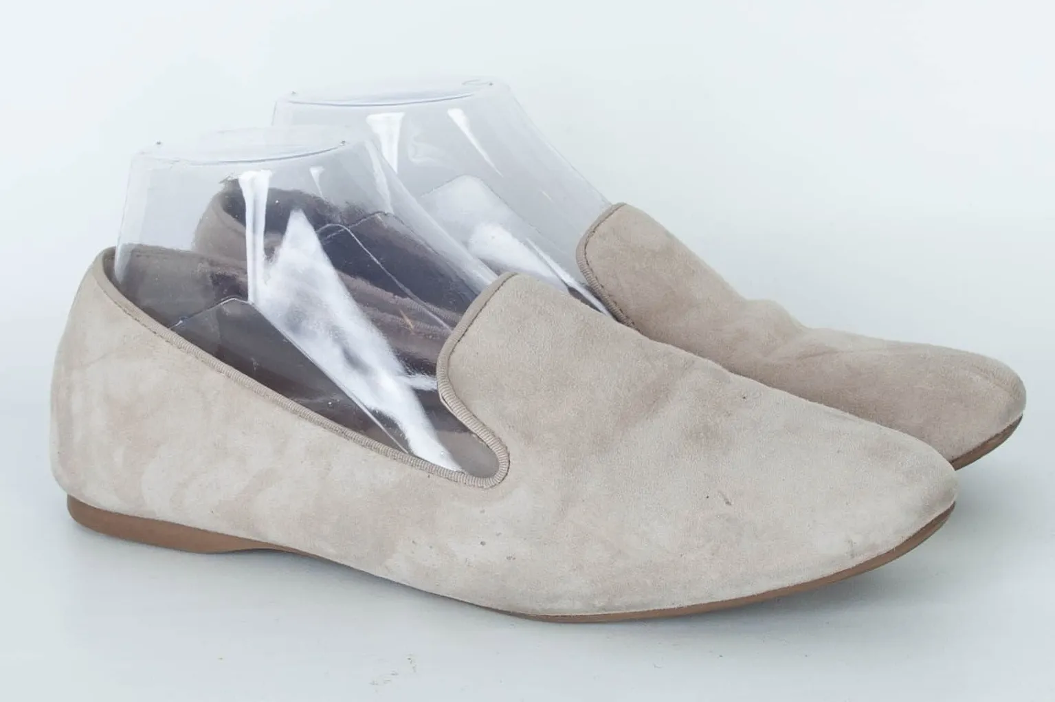 Birdies suede loafer flats in a versatile beige hue. These slip-on shoes feature a comfortable quilted insole and a subtle ribbon detail at the heel. Perfect for everyday wear, travel, or casual outings. Style: Loafer Department: Women Upper Material: Suede Features: Cushioned, Padded, Lined Occasion: Casual, Workwear Insole Material: Fabric Lining Material: Fabric Outsole Material: Rubber Type: Flat Closure: Slip On Toe Shape: Closed Toe Pattern: Solid Shoe Width: Standard Fabric Type: Suede Accents: Logo, Quilted Great pre-owned condition with some spots from everyday wear (see pictures for details) Style: Casual Everyday Staple Neutral Capsule Office Minimalist Please reach out with any questions! Super fast shipping