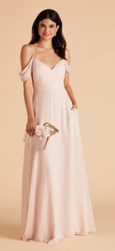 Excellent preowned condition Size small Approximate measurements for pit to pit, waist, and length. Smoke free and pet free Has been dry cleaned. This elegant pink off-shoulder dress is perfect for any special occasion. Its flowing design and delicate color make it a standout piece in any wardrobe.
