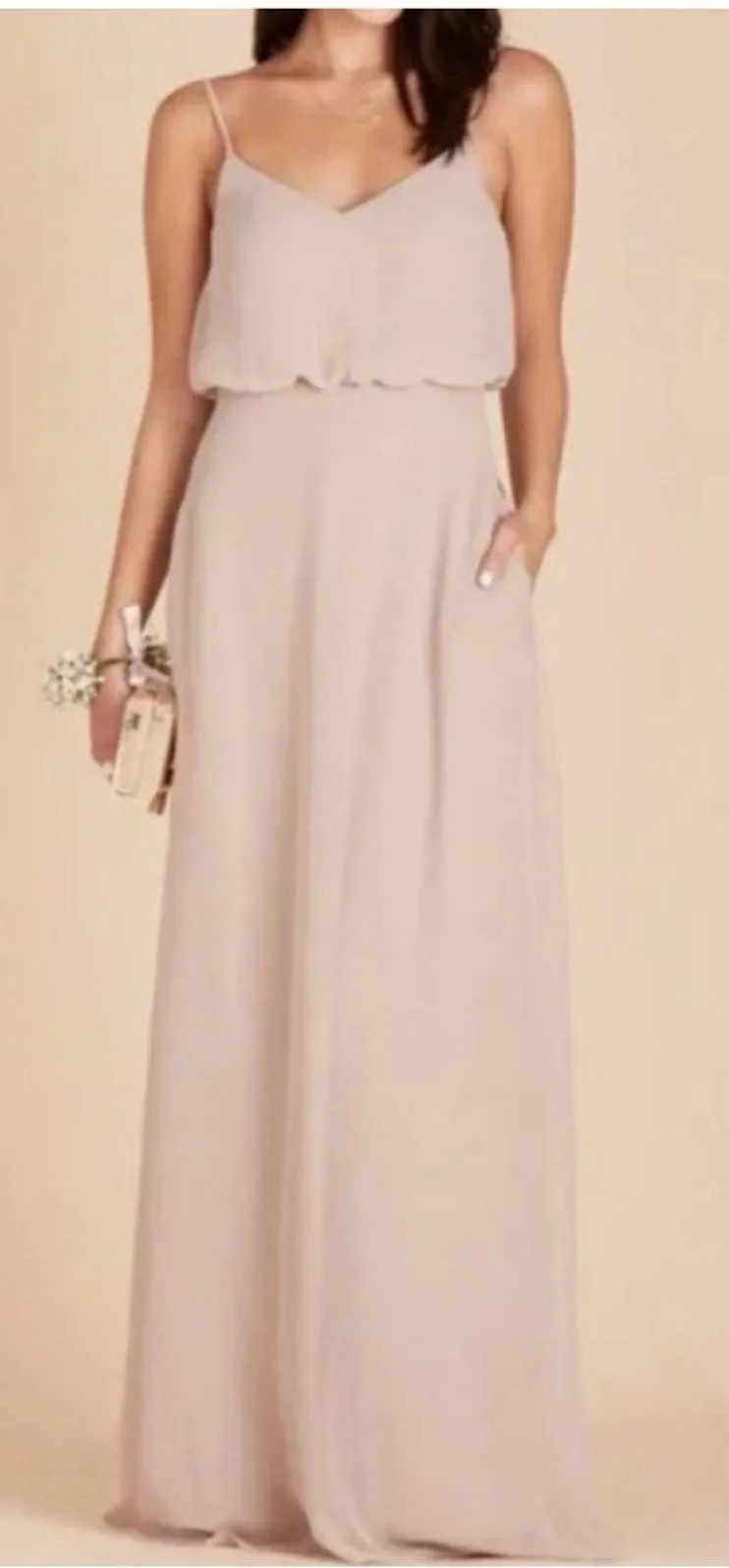 Birdy Grey Gwennie Chiffon Gown Size S Taupe Slit Prom Bridesmaid NEW TINY FLAW A classic blouson-style bridesmaid dress that never goes out of style. Simple V-neckline with thin spaghetti straps and blouson top Fitted waist with floor-length, sweeping skirt + hidden side pockets Center back zipper with hook & eye closure Adjustable straps 100% polyester chiffon shell and lining. Dry clean only Size S Bust 17.5” flat Waist 15” flat Length 60” All Measurements are approximate due to flat lay New with tags. Comes with a pin pack in case of needed repairs on the big day! Small amount of something sticky, possibly from being tried on with a breast cover, on the inside of the right top, shown in last picture. Could possibly be removed. Ships same or next day! Feel free to send me a reasonable offer! Have questions? Feel free to ask! Bundle deals available!!