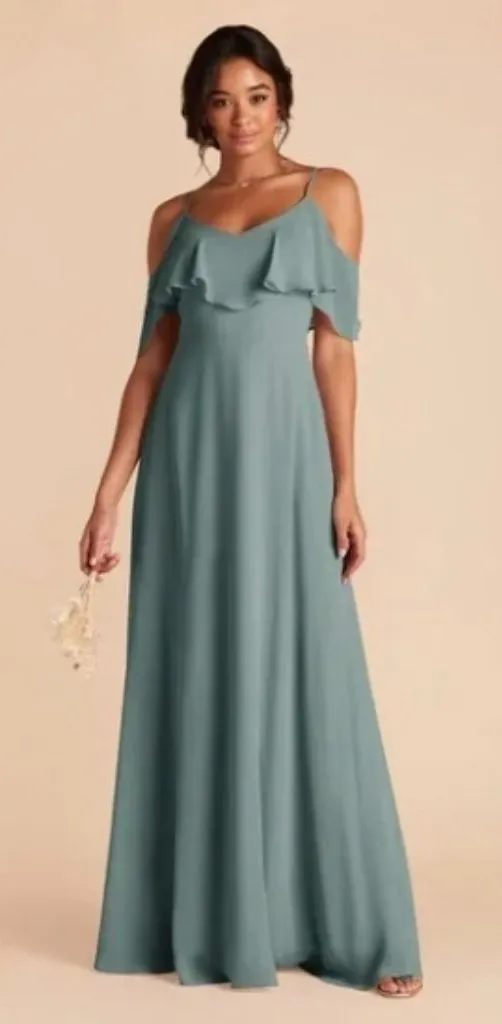 Birdy Grey Size medium women's US Style: Jane Color: Sea Glass in chiffon Draped sleeves can be worn over or under the arms in 3 different ways: cold shoulder, spaghetti strap or sleeved V-neck Fitted high waist with floor-length, sweeping column skirt + hidden side pockets Center back zipper with hook & eye closure This is the style that does not have a slit 100% polyester Measurements taken across the front when laying flat: Bust: 17", Waist: 15", Length: 62" Brand new with tags; no stains, holes or flaws I am always open to offers - bundle & save!