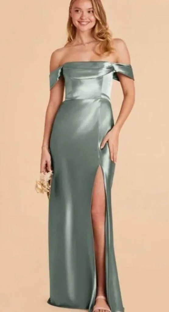 Birdy Grey Size medium women's US Mia Shiny Satin Dress Color; Sea Glass High slit; convertible and can be worn off-shoulder or strapless (does not includes strap to wear spaghetti strap) 100% polyester Measurements taken across the front when laying flat: Bust: 17", Waist: 14.5" Length: 62", Slit height: 32" Brand new with tags; no stains, holes or flaws; does not include straps to be worn as spaghetti strap I am always open to offers - bundle & save!