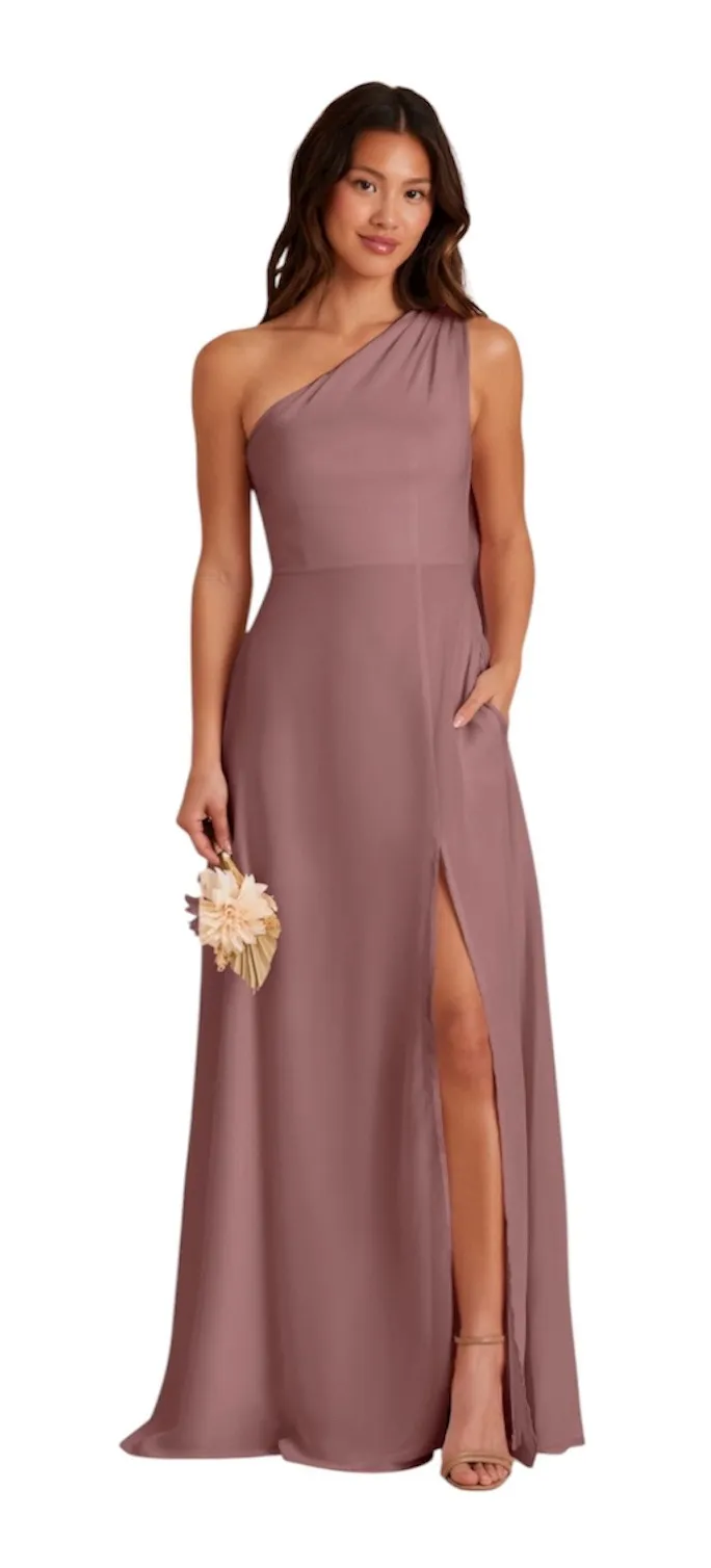 Capture timeless elegance with this stunning one-shoulder maxi dress. Designed to flatter, its flowing silhouette drapes beautifully, while the alluring thigh-high slit adds a touch of sophisticated allure. The delicately draped fabric on the shoulder creates a romantic focal point, ensuring you feel utterly radiant. This exquisite gown is perfect for making a memorable entrance at weddings, galas, or any special evening event. Measurements: • Bust: 16 1/2 in • Waist: 24 3/4 in • Hips: 58 1/4 in • Length: 58 3/4 in • Slit Length: 44 3/4 in Material: Chiffon Keywords: Birdy Grey dress, one shoulder dress, maxi dress, bridesmaid dress, formal gown, evening dress, mauve dress, pink dress, chiffon dress, thigh slit dress, elegant dress, special occasion dress, party dress, wedding guest dress