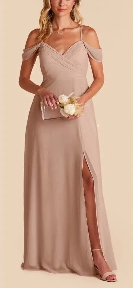 Birdy Grey Spence Taupe Chiffon Convertible Dress Bridesmaid Prom Brand new with Tags! A draped-sleeve bridesmaid dress you can wear with or without straps. Draped sleeves can be worn 3 ways: off the shoulder, cold shoulder & cap sleeve Clean pleated bodice Fully lined with built-in boning + bra cups for extra support Fitted high waist with floor-length, sweeping skirt Adjustable straps Invisible center back zipper with hook & eye closure 100% polyester chiffon shell and lining. Dry clean only Color: TAUPE Size SMALL Tags: wedding dress, bridesmaid dress, cocktail dress, formal party dress, evening dress, special occasion dress, wedding guest dress, cocktail dress, prom party dress, birthday party dress, graduation dress