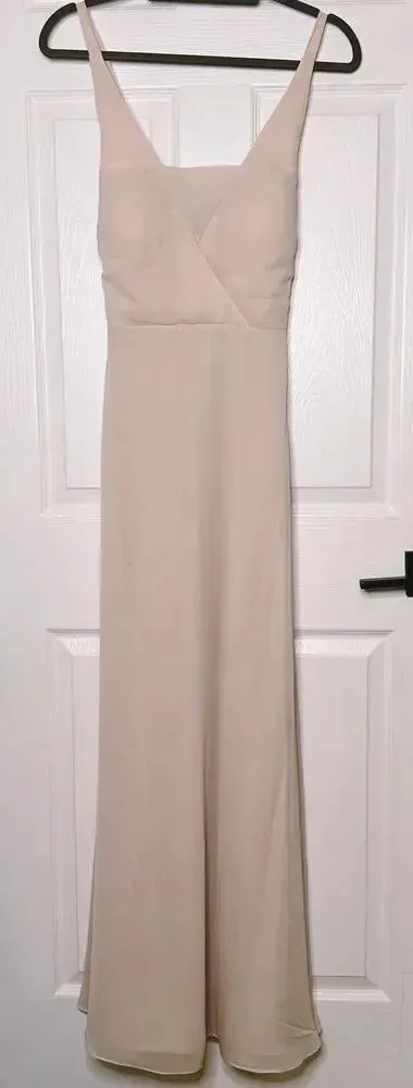 Maxi bridesmaid or special occasion dress in light pink with sewn in cups and modesty fabric covering v-neck. Cups and fabric can be unstitched if desired. Lined with pockets. *Size Small, approx: -17" armpit to armpit -13" waist -60" length *Polyester (O15) special occasion, prom, wedding guest