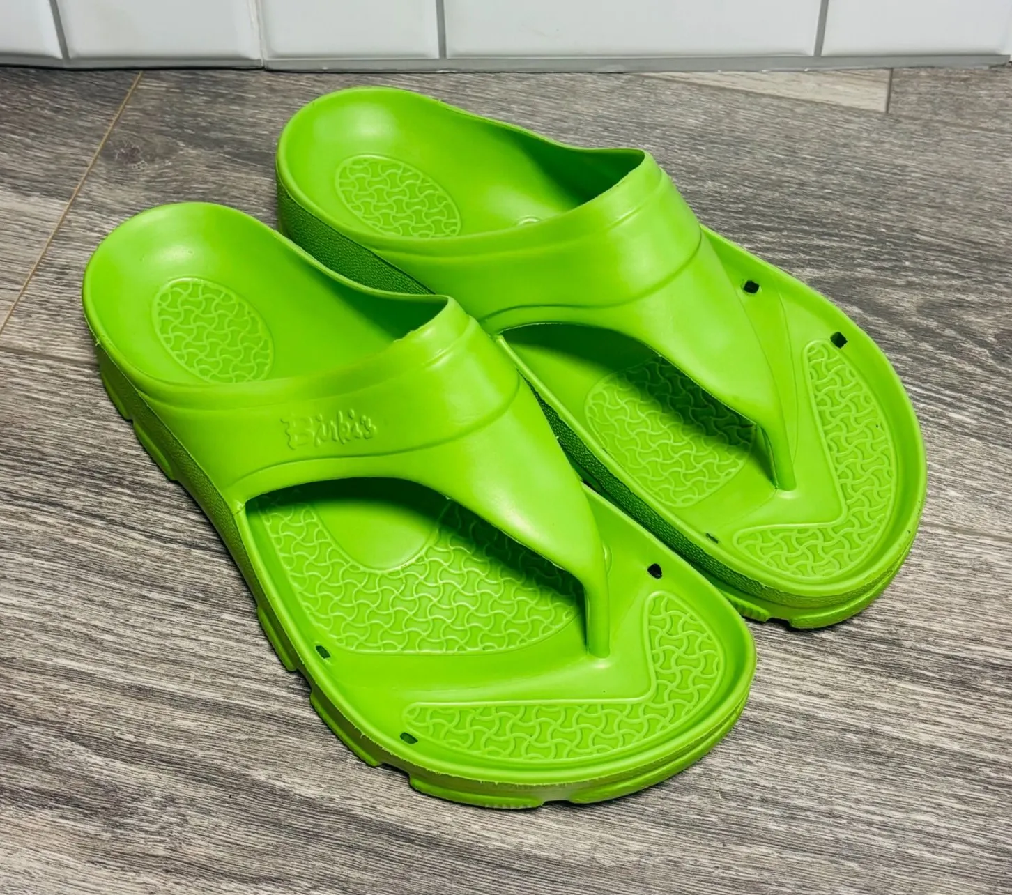 Comfortable and vibrant lime green flip flops, perfect for adding a pop of color to your casual ward... Show more