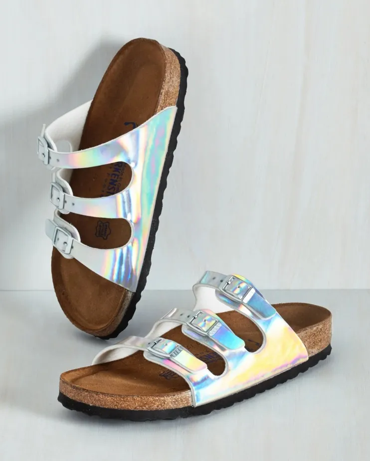 Birkenstock Florida Three-Strap Comfort Footbed Holographic Silver Slide Sandal Size EU 38(US 7-7.5)... Show more