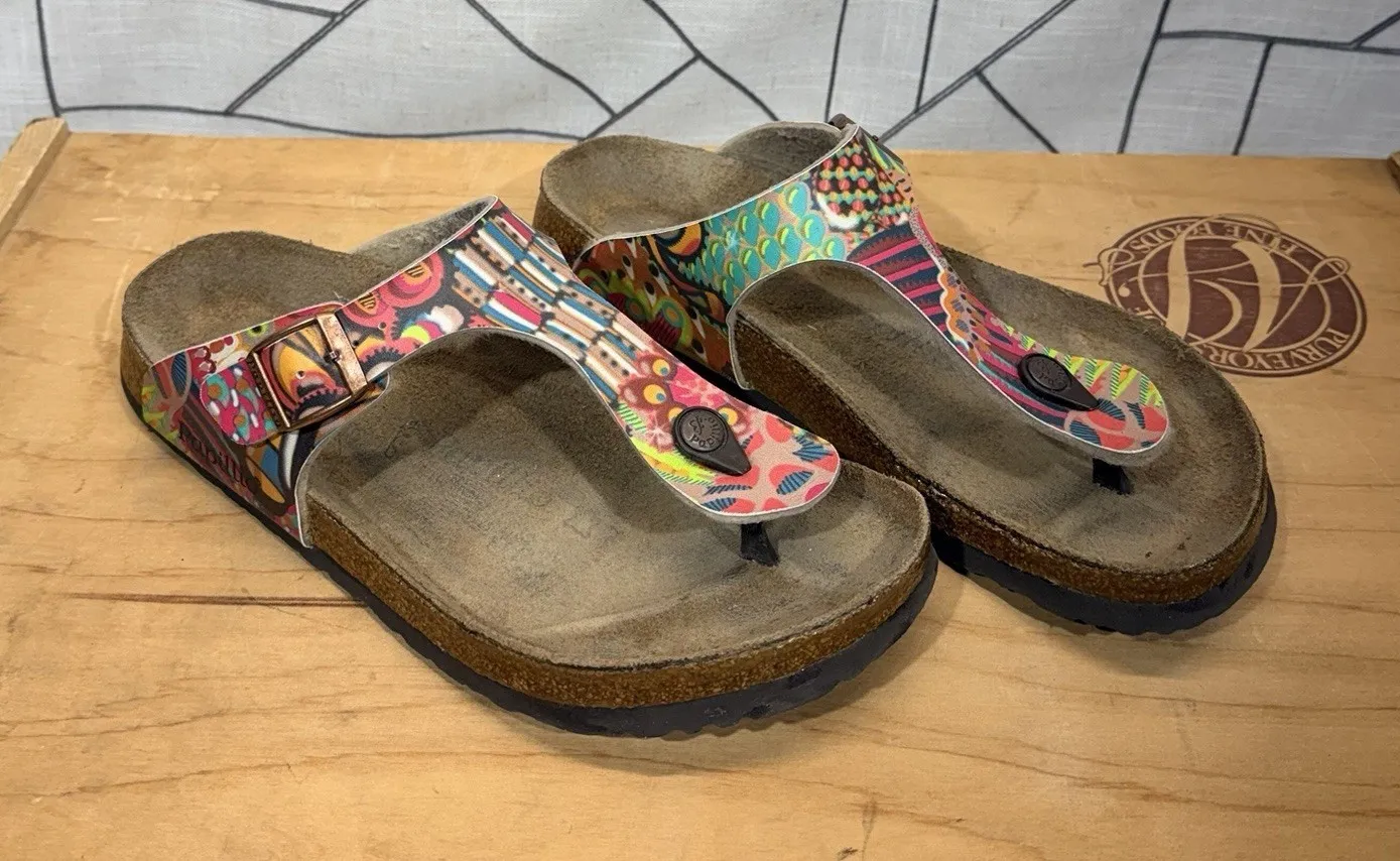 SEE WEAR IN PICS The BIRKENSTOCK GIZEH BIRKO-FLOR THONG SANDALS in pink, teal, and yellow are a sty... Show more
