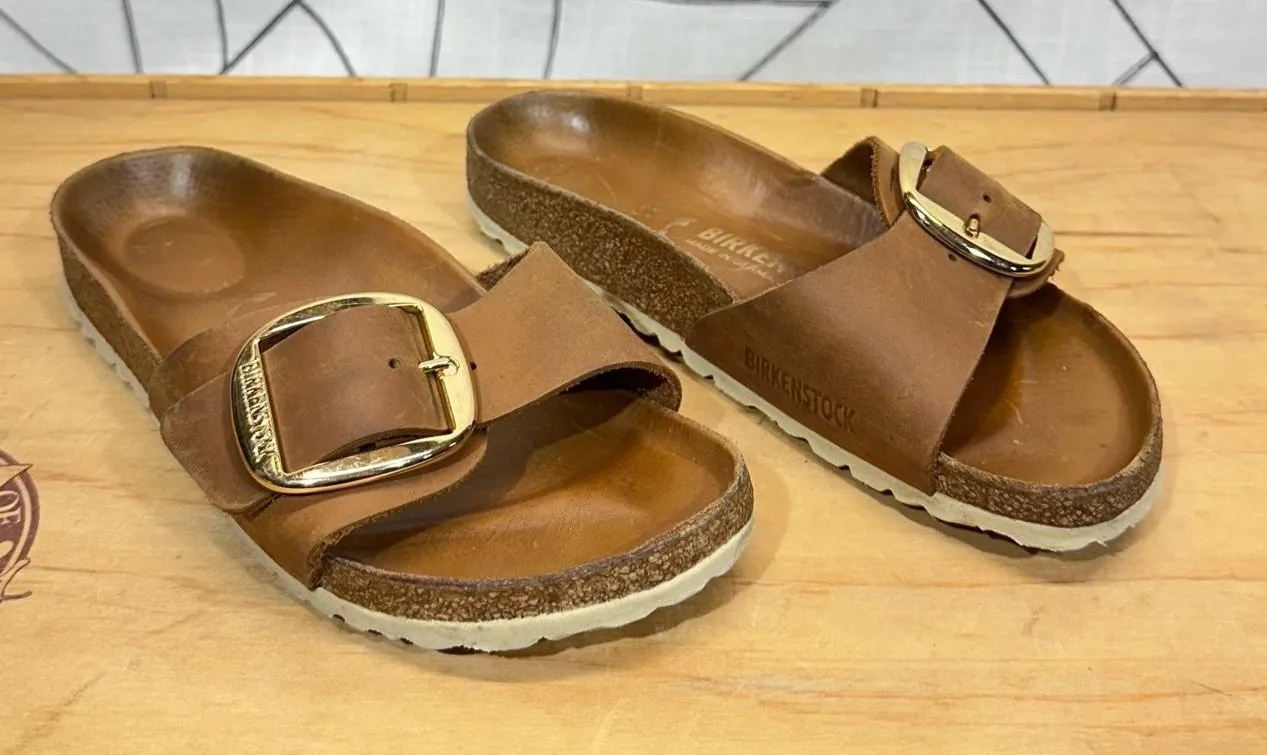 This Birkenstock Madrid Big Buckle sandal features a stylish brown oiled leather upper with a promin... Show more