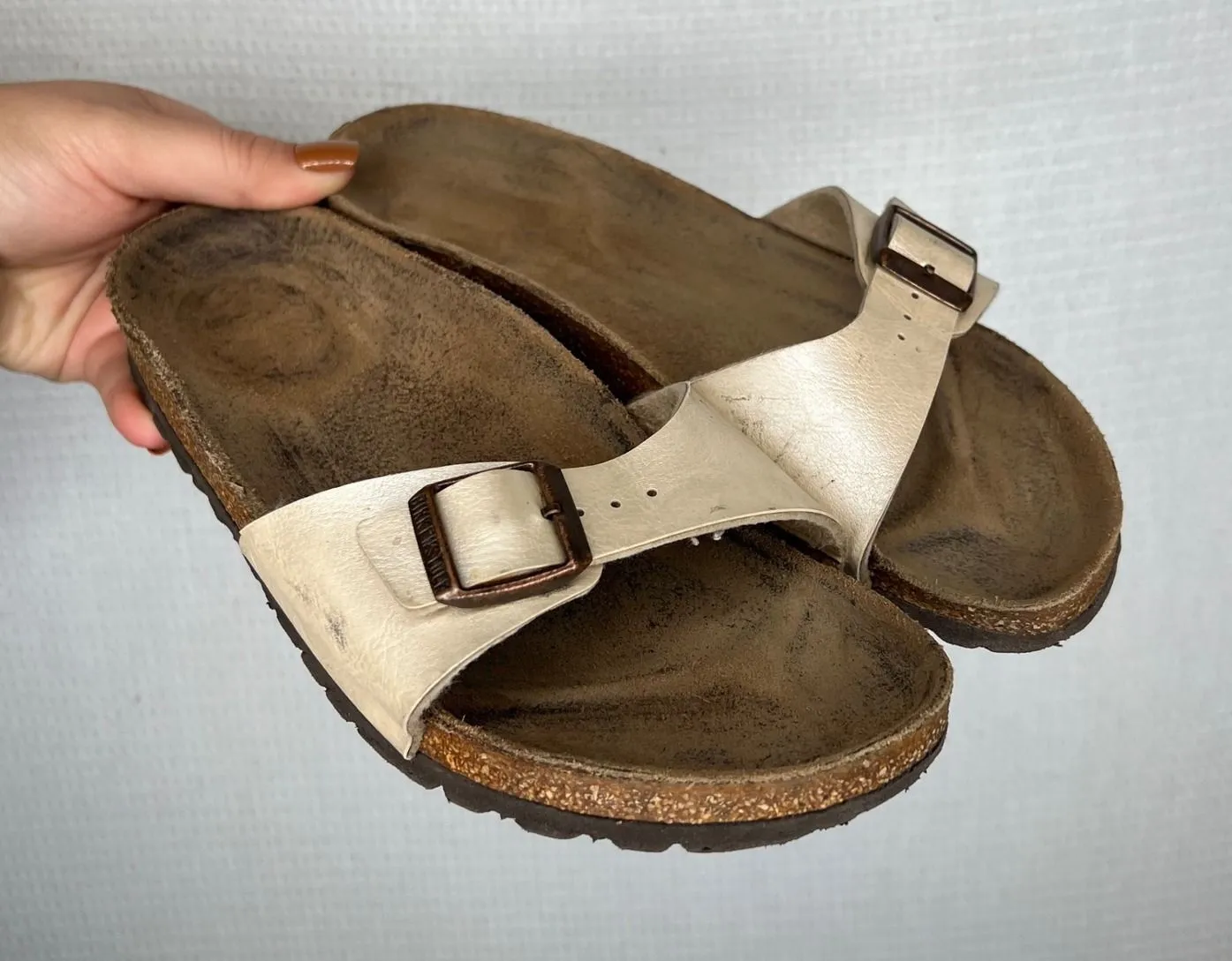 Birkenstock Madrid One Strap slip-on sandals in a cream leather finish with a classic cork footbed.... Show more