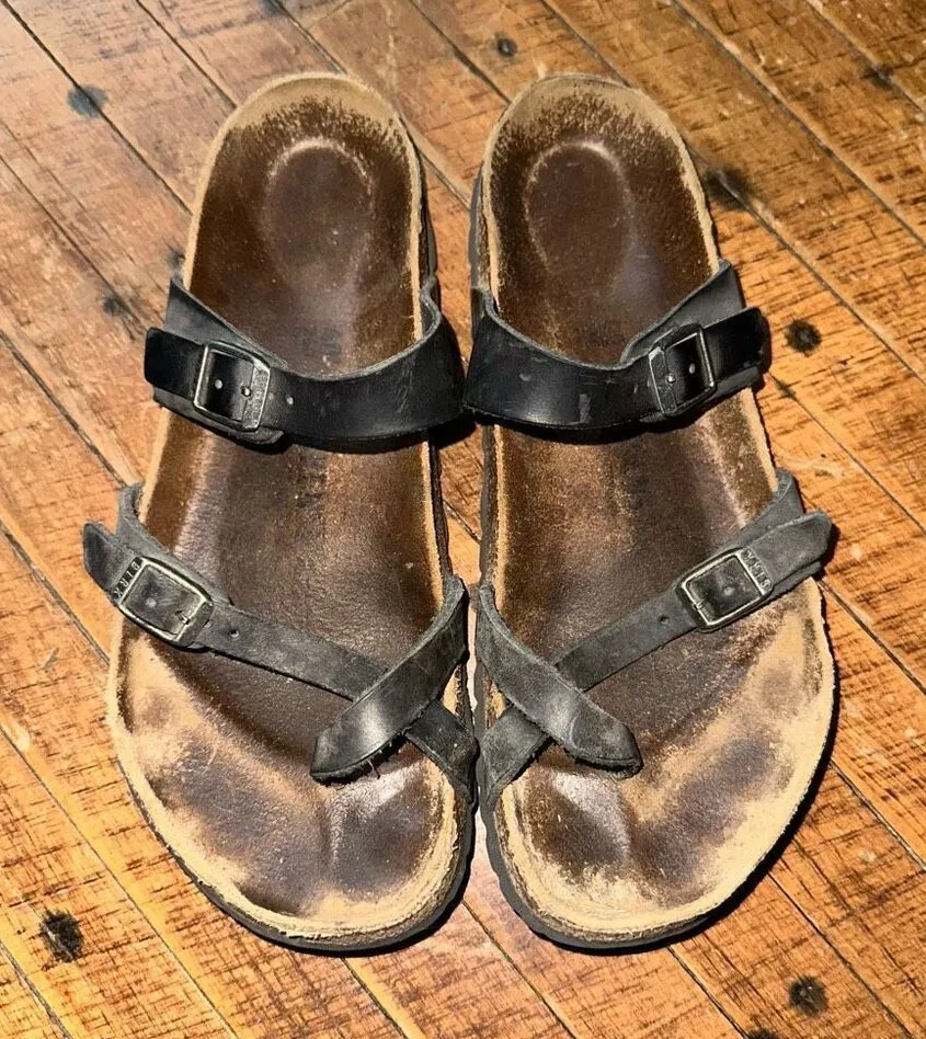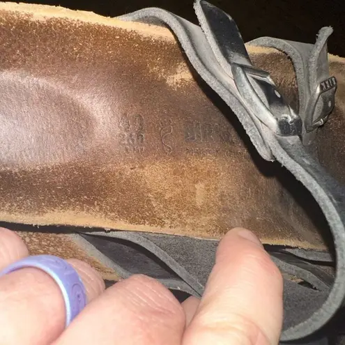Birkenstock Mayari, strappy, ortho, black, cork, arch support sandals. Note the wear one the insole.... Show more