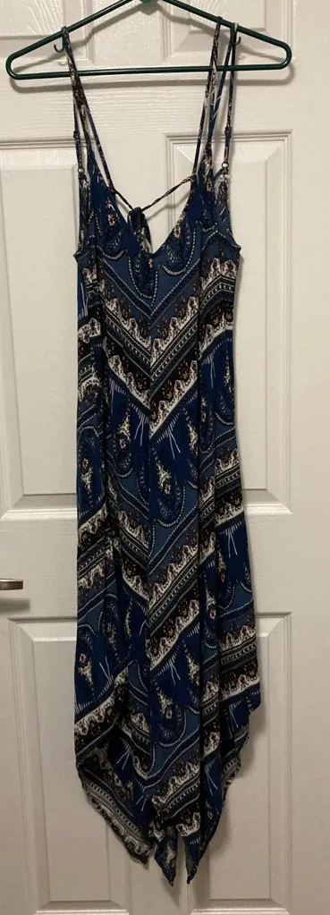 Great Condition Blue, White, Black, Orange & Navy Blue Paisley Print V Neck Deep V Back Double Spagh... Show more