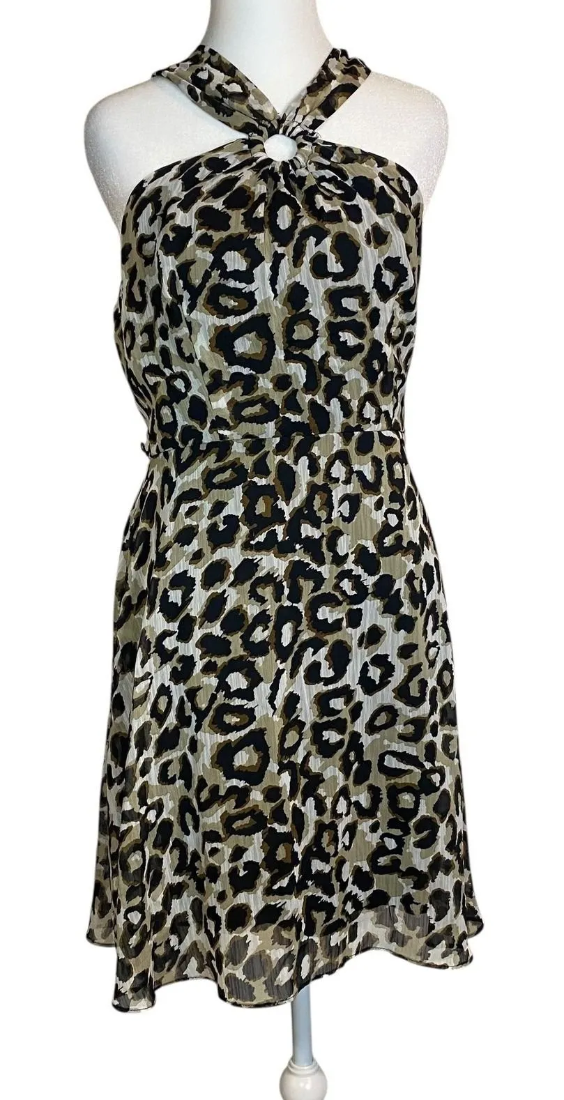 Unleash your inner wild side with this captivating Bisou Bisou dress! The striking leopard print in shades of black, beige, and brown creates a bold and unforgettable statement. The unique halter neckline with a stylish ring detail adds a touch of modern elegance, while the sleeveless design keeps you cool and comfortable. The flattering A-line silhouette flows beautifully, making it perfect for dancing the night away. A concealed back zipper ensures a seamless fit. This dress is ideal for a cocktail party, a night out with friends, or a special date. Style: A-Line, Fit & Flare Dress Length: Midi Color: Beige Department: Women Sleeve Length: Sleeveless Pattern: Animal Print Occasion: Party/Cocktail Material: Polyester Neckline: Halter Fabric Type: Woven Character: Party Girl, Glam, Wild Thing, Date Night, Cocktail Season: Summer, Spring, Fall Keywords: Bisou Bisou dress, halter dress, leopard print dress, sleeveless dress, cocktail dress, party dress, animal print, size 10 dress, women's dress, A-line dress, midi dress, special occasion dress, going out dress, date night dress
