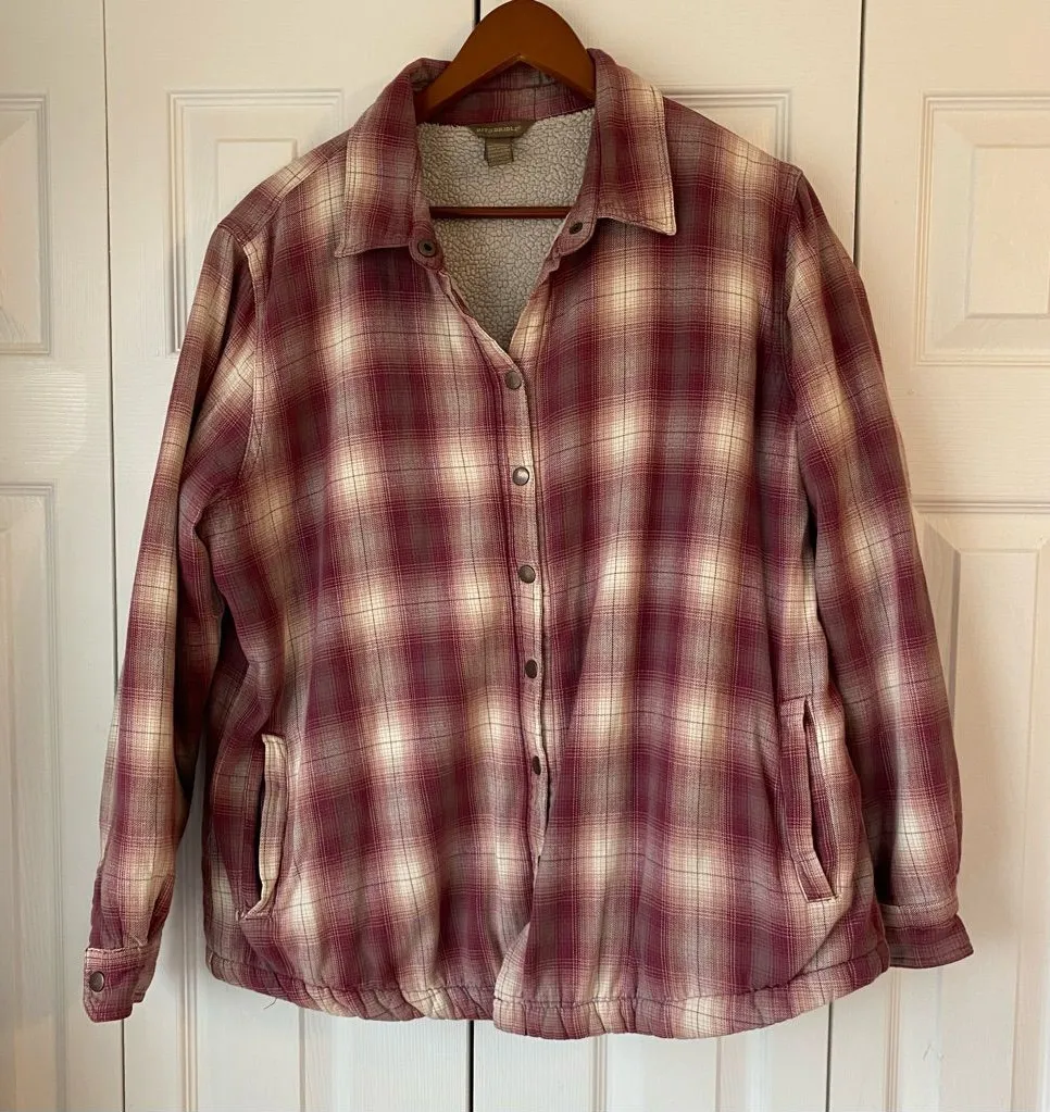 Features: Pink/Red and black plaid patter Long sleeve, thick, heavy, warm Sherpa lined Cotton outer and poly lining Snap buttons Front pockets Condition: preloved, excellent condition Please view all pictures before purchasing. Color from picture may bath slightly due to differences in lighting Measurements approx: Shown in photos Keywords: Western, outerwear, farm, field, workwear, chore coat