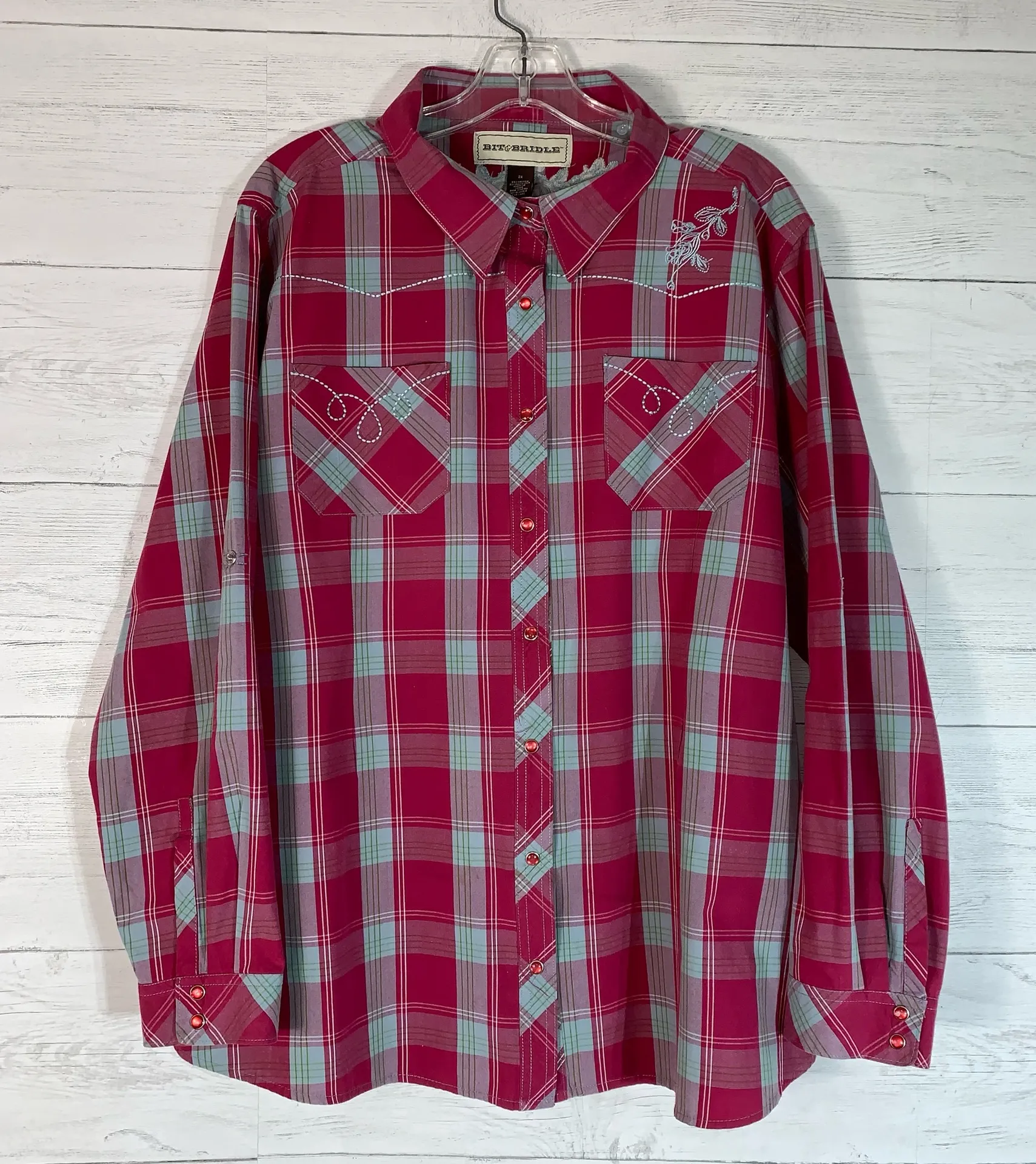 Bit & Bridle Pearl Snap Button Shirt Womens 2X Barbie Pink Cowgirl , roll tab sleeves, embroidered... Show more