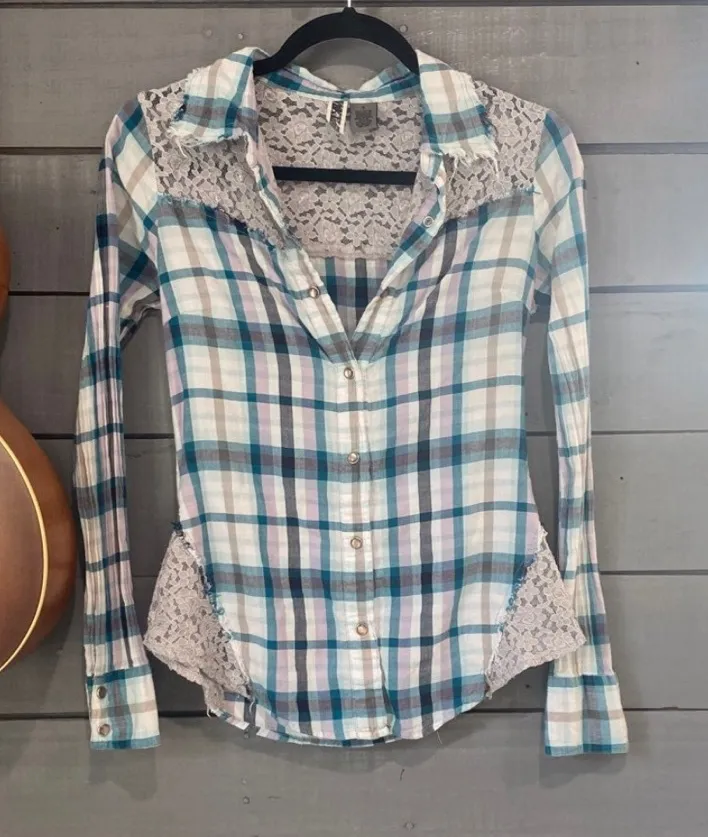 BKE Blue Plaid Lace Button Down Shirt - $15 - From Alexis