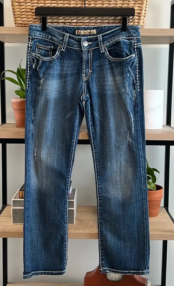 . 99% Cotton, 1% Spandex mid-weight denim fabric. Intentional light factory distressing. 5 pocket design. Zip fly w/logo shank button. Style #: BKL2235. EUC- no wear to note. Measurements taken flat: Width: 16" Front Rise: 8.5" Inseam: 27.5" Leg Opening: 8"