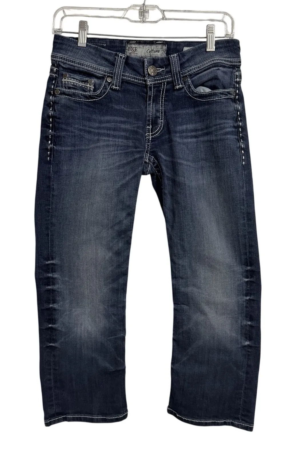 Measurements: • Waist: 15 inches • Length: 30 inches • Inseam: 26 inches • Rise: 10 inches Style: Straight Department: Women Fabric Wash: Medium Waist Size: 30 in Type: Jeans Accents: Studded, Embroidered Features: Distressed Fit: Slim Pattern: Solid Rise: Mid (8.5-10.5 in) Fabric Type: Denim Inseam: 26 in Material: Cotton Blend Closure: Button, Zip Model: BKE Sabrina Season: Spring, Summer, Fall, Winter Keywords: BKE Denim, bootcut denim, dark wash jeans, women's jeans, designer denim, embellished pockets, western style, country western, casual wear, everyday denim, stretch denim, bootcut fit
