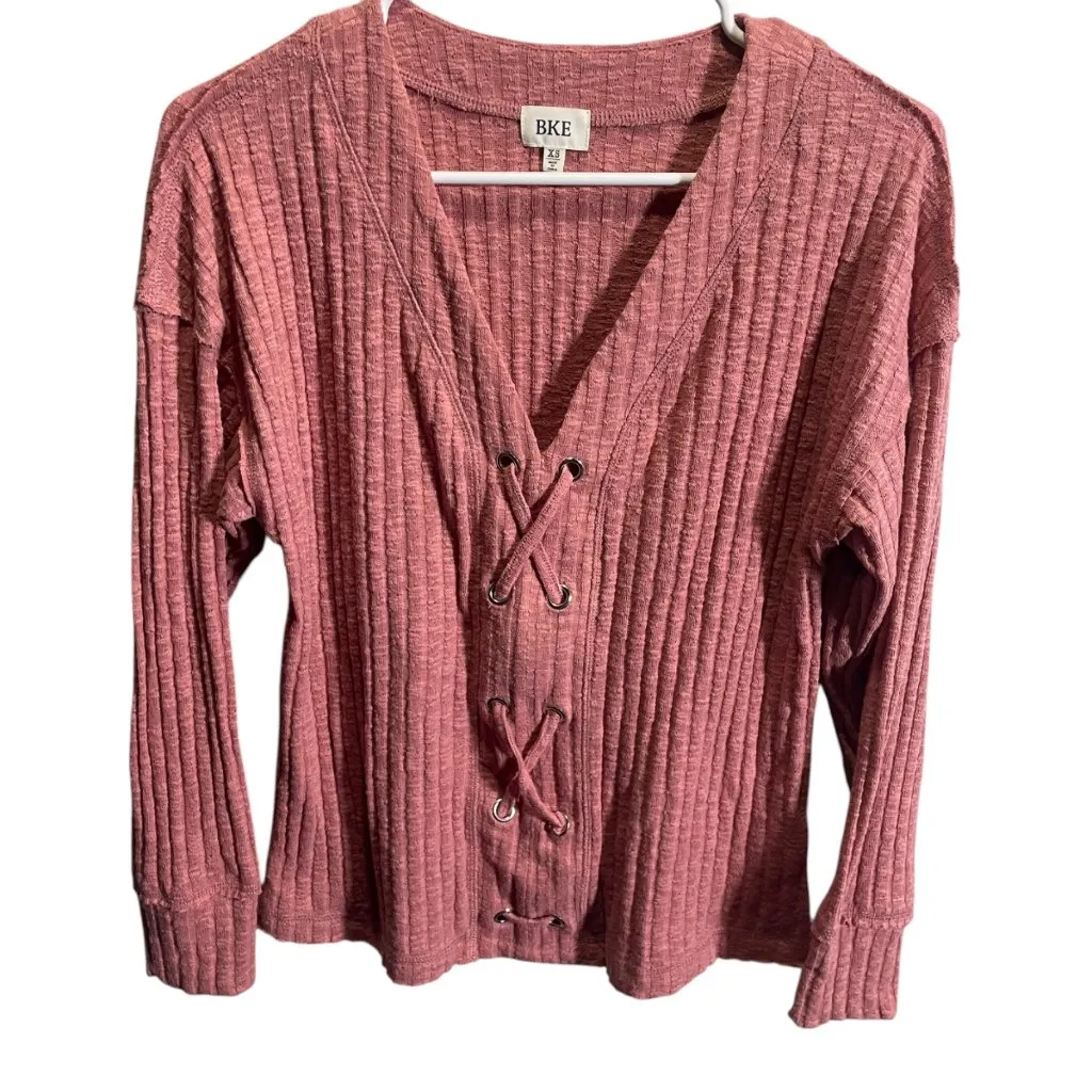 Ribbed knit long sleeve top with lace-up detail, deep V-neckline, and soft texture for stylish comfort. Made from lightweight material in a rose pink shade. • Deep V-neck with lace-up design • Lightweight ribbed knit material • Long sleeves with soft stretch • Casual and versatile wear Features: • casual • All season • ribbed • China • Hand wash cold Size: XS Condition: Pre-Owned Like New