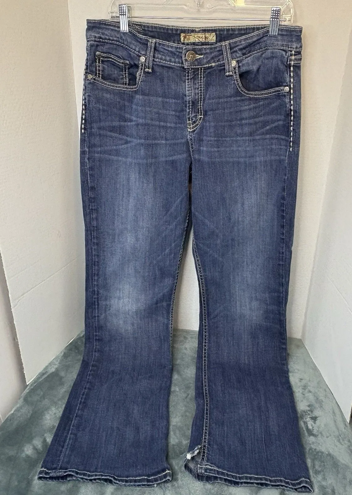 The BKE Taylor Jeans for women in size 32 feature embroidered pockets and a distressed design, giving them a unique cowgirl style. Made of denim fabric with a mid-rise and bootcut style, these jeans are easy to care for and perfect for all seasons. The jeans have a 5-pocket design with a zip closure and belt loops, making them both stylish and functional. The dark wash and solid blue color add to the overall American cowboy theme, making these jeans a versatile and trendy addition to any wardrobe.