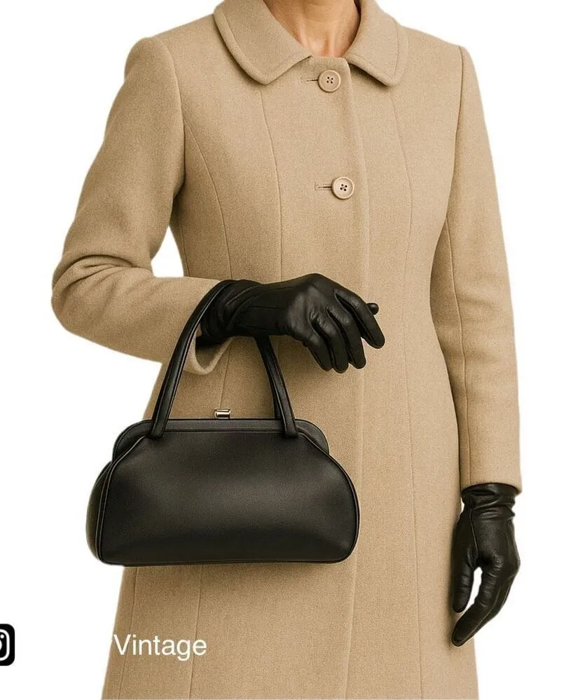 Black Aetna made in USA vintage faux leather satchel. This is a sweet little bag with minimal wear. Double handles and lift latch. Exterior is a black leather look and feel vinyl. Inside is a tan vinyl with a sidewall zippered pocket. Signs of wear are : at latch minor finish wear, on feet on bottom. One spot on each side where the hinges rubbed on bag.