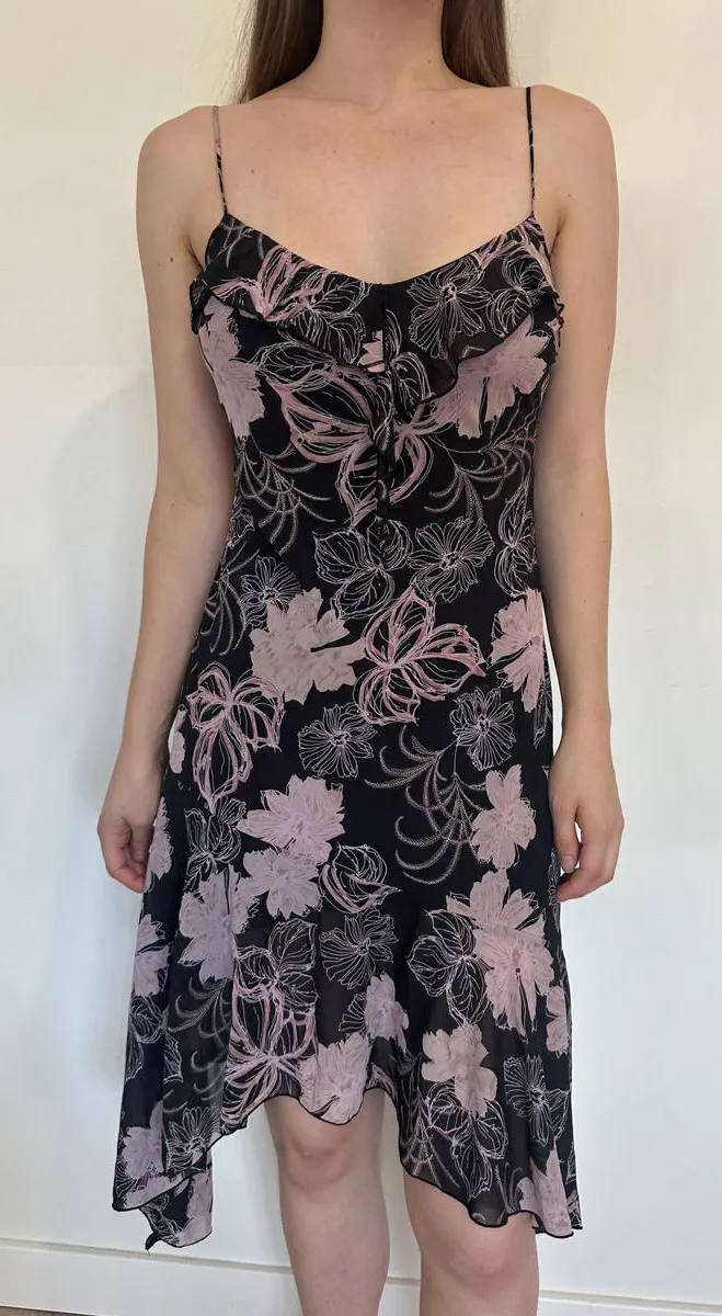 The prettiest black and pink floral dress with spaghetti straps, asymmetrical hem, and ruffle detail... Show more