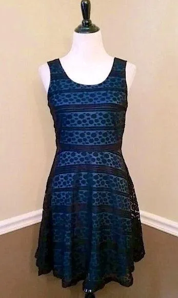 Doe & Rae "Ain't Life Glam" Dress. A colorful twist on the standard little black dress! Teal turquoise blue sleeveless dress with patterned black lace overlay. Fully lined. Back zipper with hook and eye closure. New with tags Sold Out on Modcloth Size Large Shell: 92% Nylon, 8% Spandex. Lining: 100% Polyester. Mesh only has a bit of stretch. Lining has stretch. Hand wash. Approximate Measurements - Taken with garment lying flat Bust: 18 inches Waist: 15 inches Length: 35.5 inches Clean, smoke-free home and studio. 5 star seller. Super fast shipping! LBD, party, formal, dance, pageant, clubbing, sexy, NYE, Las Vegas, cocktail, glam, red carpet, special occasion Goth, whimsigoth, fairy goth, lace, dark SKU#B1531 11B