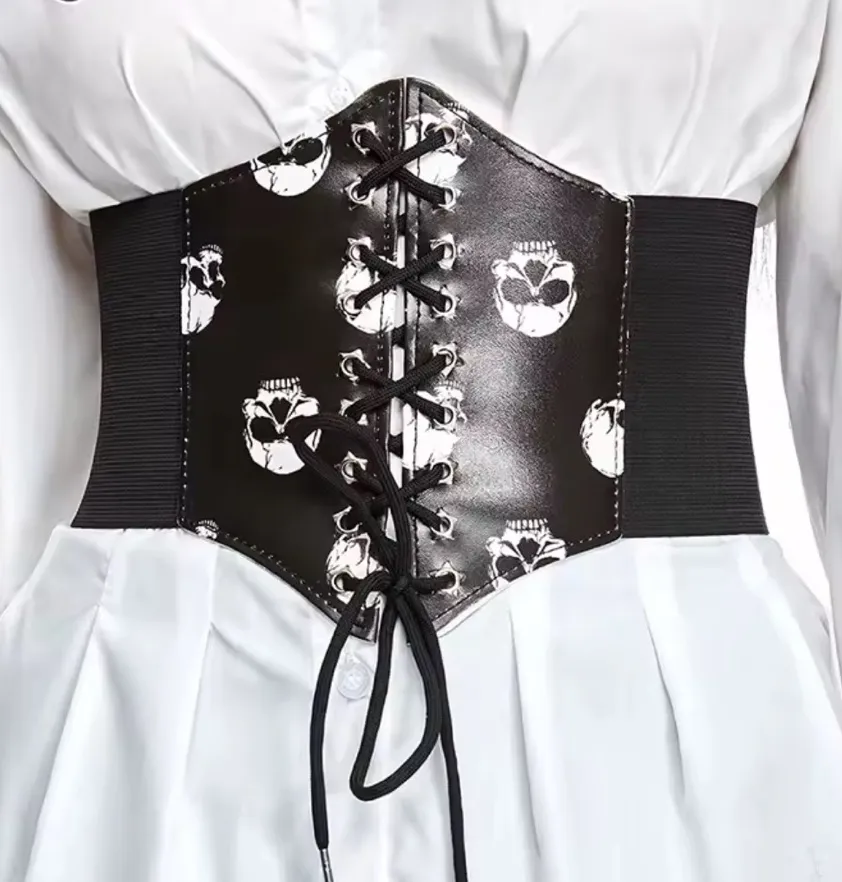 Elevate your style with the Black and White Corset Belt. This chic accessory features a striking black and white design, perfect for adding a bold touch to any outfit. black skull waist cover with pentagram eye decoration Y2K Gothic dark punk style Halloween essential accessor