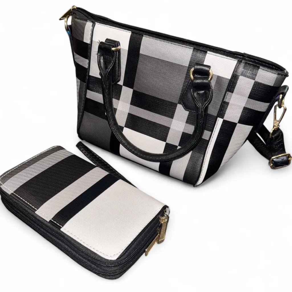 black and white plaid purse and matching wallet set. • Purse: approx. 8” tall x 12” wide, includes detachable crossbody strap • Wallet: approx. 7.5” long x 4.5” wide • Gold-tone hardware, zip closures, and clean interiors • Light wear on purse, seen in photos