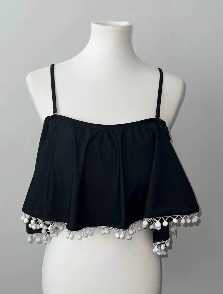 Chic and stylish black of shoulder bathing suit, bikini swimsuit top with playful white pom-pom trim. You can remove the adjustable straps. Also has removed cups. Women's size large 82% Nylon; 18% Spandex