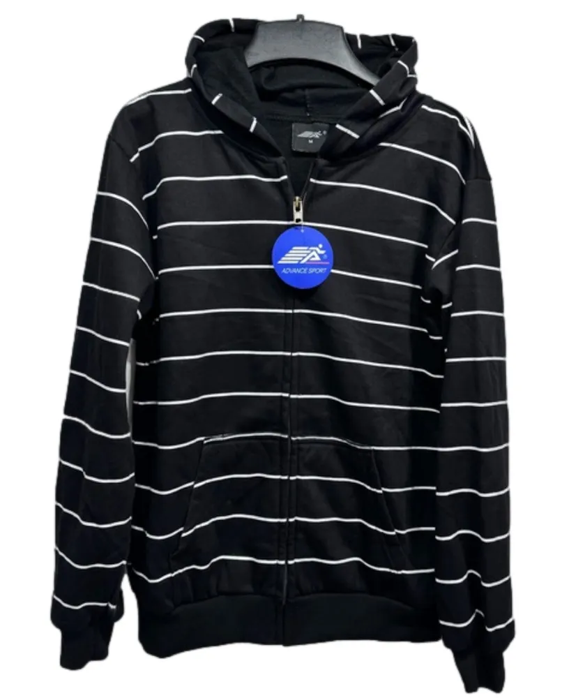 Advance Sport black zip front hoodie with white stripes. Long sleeves, split kangaroo pocket. Soft a... Show more