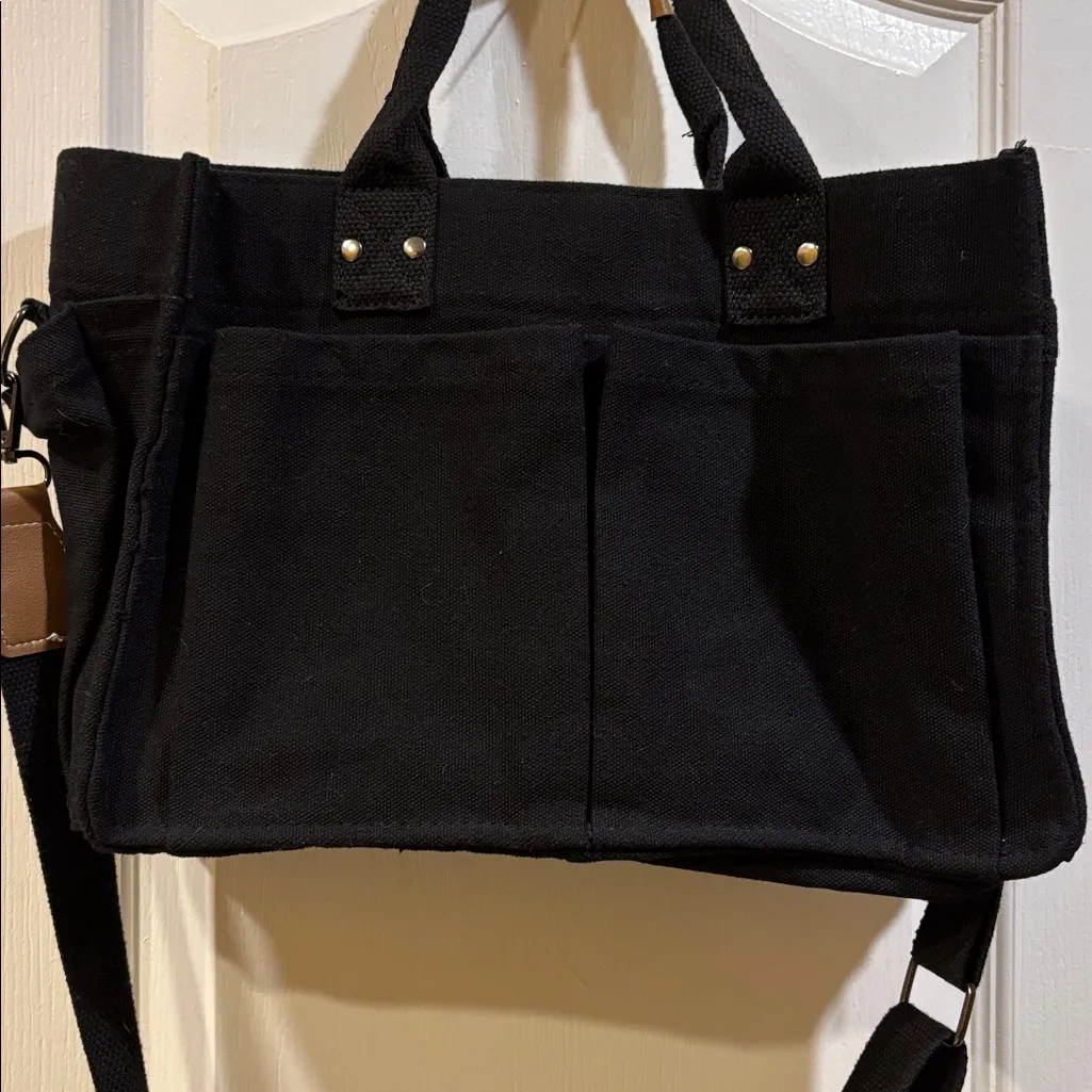 Stylish black canvas tote bag featuring brown handles and accents. Perfect for everyday use. VERY VERSATILE CAN BE USED FOR EVERYDAY USE TRAVEL.. GARDENING.. SCHOOL..ETC THICK BLACK CANVAS SNAP CLOSURE NICE BAG ❤️