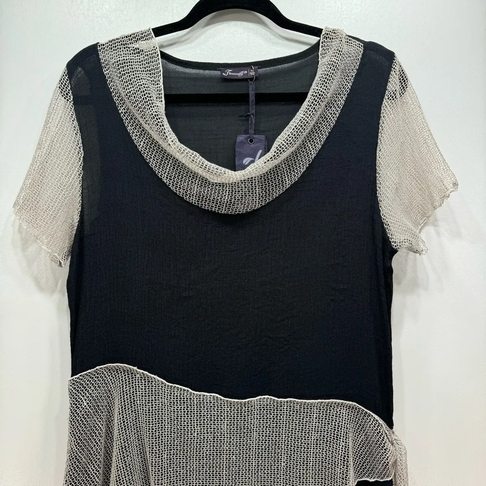 Firmianalily semi sheer black crepe short sleeve tunic length top with ruffles at the bottom and beige mesh sleeves, yoke and tied in a knot across the middle. Mesh has sequins. Very unique, boutique style top! Women’s size extra large. Brand new with tags! Clean, smoke free home and studio. Five star seller. Super fast shipping! Measurements 20” armpit to armpit 33” length *measurements are approximate Summer, party, resort wear, cruise wear, vacation SKU# 245760 37