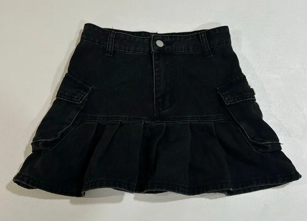Trendy black denim mini skirt in size XS featuring a ruffled hem and cargo-style utility pockets. Has that soft, slightly stretchy denim feel (70% cotton blend) for a comfy yet structured fit. Perfect for a streetwear, Y2K, or casual weekend look — pairs effortlessly with crop tops, hoodies, or oversized tees. Open to offers! Pet-friendly home and non-smoking environment.